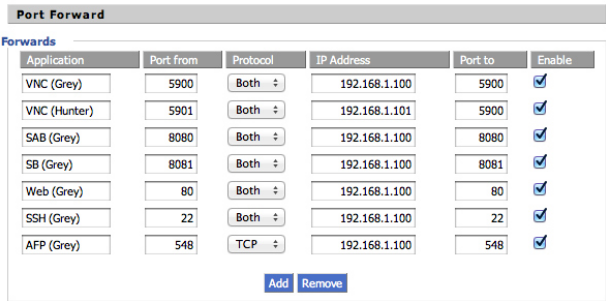 - Port from – “Port from” is the port on your external IP address. Generally you’ll also enter the same port as you would in the “Port to” field. This works just fine when you’re configuring only one machine for one type of service. But say you wanted to be able to remotely access two or more computers using VNC. If you used 5900 on a single, external IP address they would be in conflict. The router would see a request for port 5900 and not know which local IP address should handle that request since the port forwarding table has two. To solve this problem, you can use the standard port for one and not for the other—kind of like an apartment building has a single address but multiple apartments. As you can see in the sample routing table above, Grey’s “Port from” is set to 5900 while Hunter’s “Port from” is set to 5901. If you try to use VNC normally on my external IP address, you’ll be asked to log in to Grey because it uses the standard port. If you want to access Hunter, however, you can easily do so by just using port 5901 instead of the default. This way you can set up identical services with a single external IP address without conflicts.