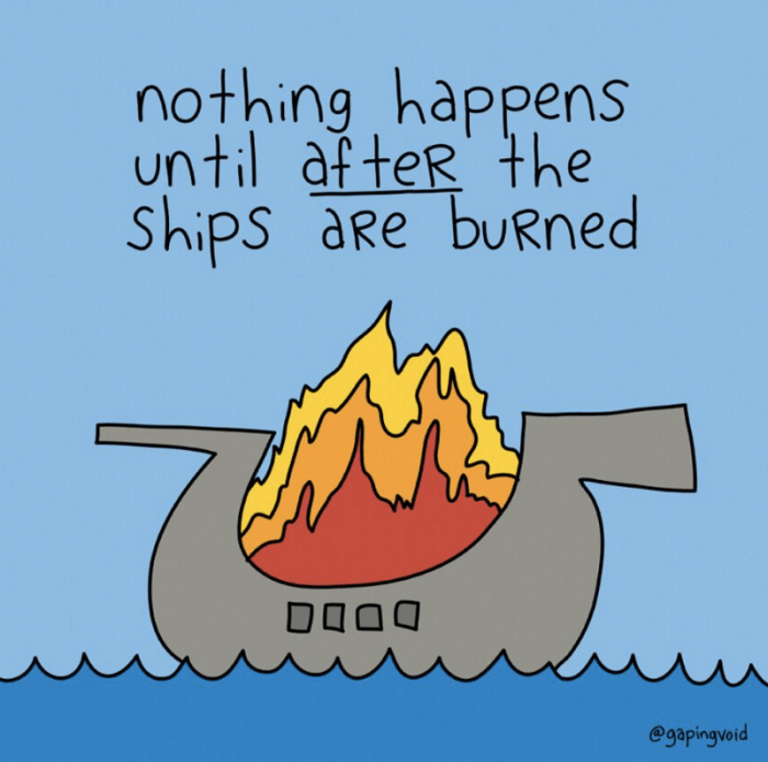 Once you’ve passed your point of no return, you’ve fully bought into your own vision. You’re committed. Your role, and thus identity, change. You’ve removed alternatives that were nothing more than distractions anyways. You’ve forced your own hand and now must move in the direction you want to go. You’re all in.