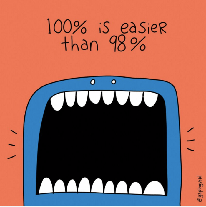 98% commitment is a slippery-slope. When you’re not completely certain what you’re going to do in a given situation, you must then rely on willpower. And of course, with enough experience, you quickly come to realize that willpower doesn’t work so well. Decision is far more powerful. There’s a reason most people live far beneath what they could. They never make truly committed decisions and then stick to those decisions.