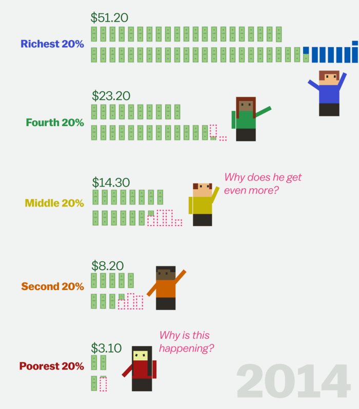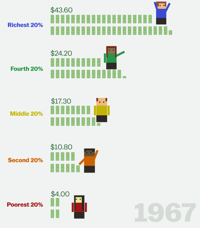 The poorest 20 percent are wearing red shirts. The second 20 percent are wearing orange, and so on:
