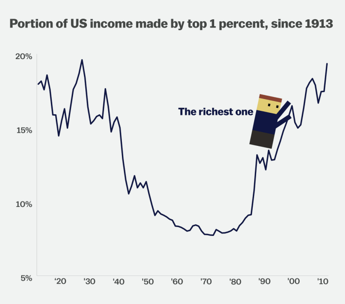 You can see that in this graph. It shows that, from the 1940s through the mid-1980s, the richest one person got a much smaller portion of the whole: