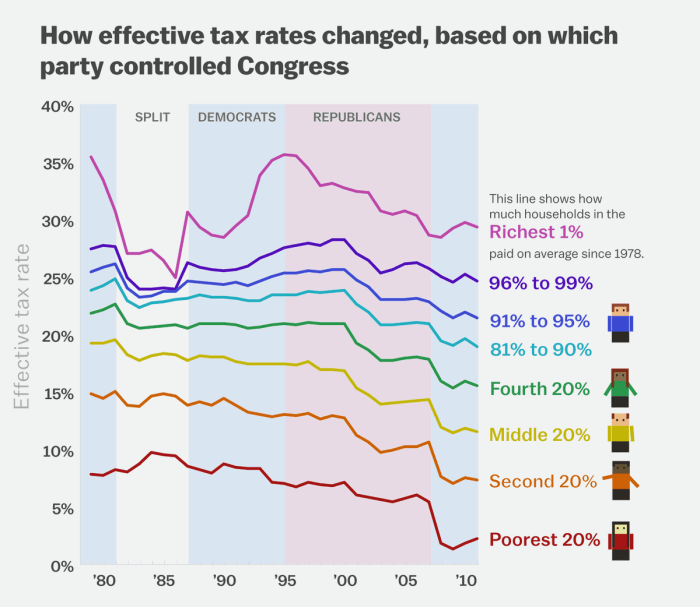 Here’s the same chart, but showing who controlled Congress when these effective tax rates changed: