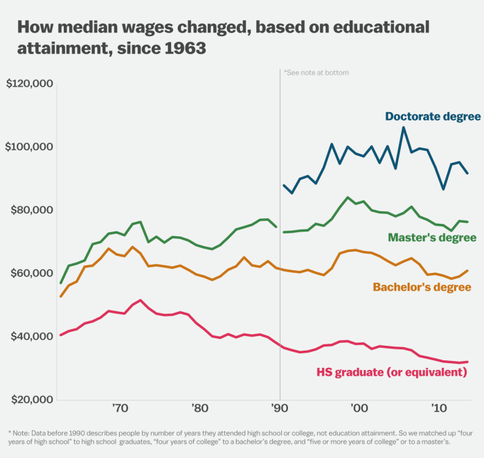The chart below shows that those with bachelor’s degrees or less have seen stagnant or falling wages, while those with master’s and doctorate degrees have generally seen rising wages.