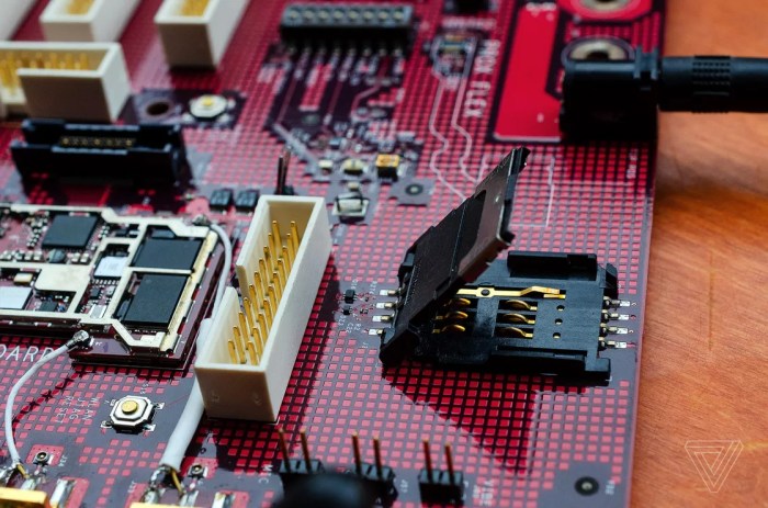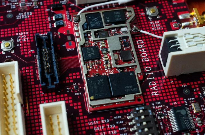 At first glance, the red iPhone M68 prototype board looks like a motherboard you’d find inside a PC from more than 10 years ago. It’s roughly the same size, but the components are a little different. Apple developed this particular board, an engineering validation test (EVT) sample, for engineers working primarily on the software and radio portions of the original iPhone. These developers wouldn’t know the final form of the iPhone, and sometimes these boards were even supplied without the screen you’ll see attached in our exclusive photos. Apple only uses red printed circuit boards for its prototype iPhone hardware, favoring blue, green, and other colors for production units.