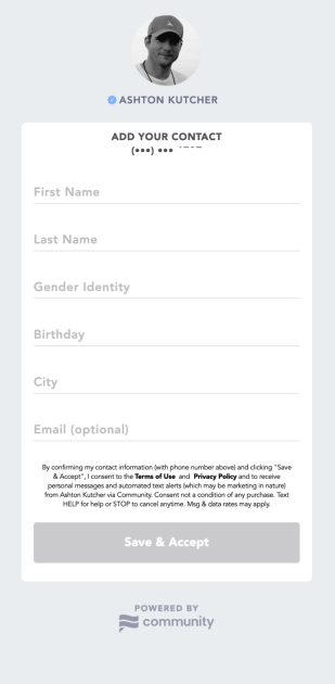 This reporter, of course, followed up Kutcher on his offer and sent a text to his now preferred contact. Instantaneously, I received this reply: “Ashton here. This is an auto-text to let you know I got your message, the rest will be from me. Click the link so I can respond to you. I likely can’t respond to everything but I’ll try to be in touch. Dream bigger.” The message was accompanied by a link to a Community sign-up page for Kutcher-specific updates. The fine print read that the personal messages and automated text alerts from Kutcher “may be marketing in nature,” but little other information was provided.